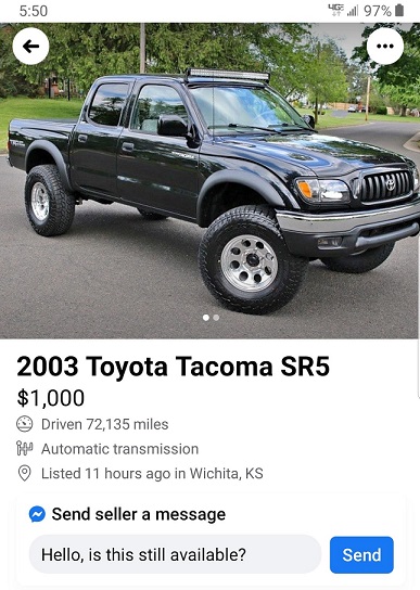 A 2003 Toyota Tacoma SR5 is showing up in multiple locations on the marketplace and the Sheriff’s Office is aware of at least one victim who lost their money in purchasing Gift Cards to buy the pickup.