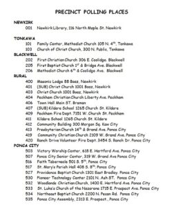 TUESDAY, JUNE 30, IS THE PRIMARY ELECTION FOR THE STATE OF OKLAHOMA, INCLUDING THOSE IN KAY COUNTY. ON THE BALLOT FOR KAY COUNTY ARE SEATS FOR BLACKWELL AND KILDARE SCHOOLS, BLACKWELL MAYOR, NEWKIRK CITY COMMISSION, KAY COUNTY COURT CLERK, STATE QUESTION NO. 802, STATE SENATE AND  U.S. SENATE. YOU CAN SEE A LIST OF POLLING PLACES IN KAY COUNTY DOWN BELOW. AS FOR HERE IN KANSAS, THE STATE PRIMARY IS AUGUST 4.